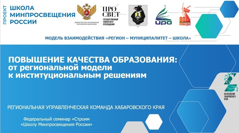 6 июня 2025 г. управленческая команда Хабаровского края презентовала опыт "Повышение качества образования: от региональной модели к институциональным решениям" на федеральном семинаре рамках федерального семинара "Строим "Школу Минпросвещения России". Семинар посвящен комплексному сопровождению реализации магистрального направления "Знание" и выявлению эффективных управленческих решений.
