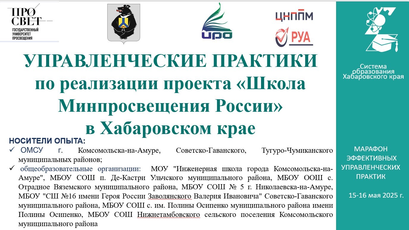 15 - 16 мая 2025 года на базе краевого государственного автономного образовательного учреждения дополнительного профессионального образования "Хабаровский краевой институт развития образования имени К.Д. Ушинского" состоялся традиционный "Марафон эффективных управленческих практик общеобразовательных организаций" по реализации проекта "Школа Минпросвещения России" в Хабаровском крае.